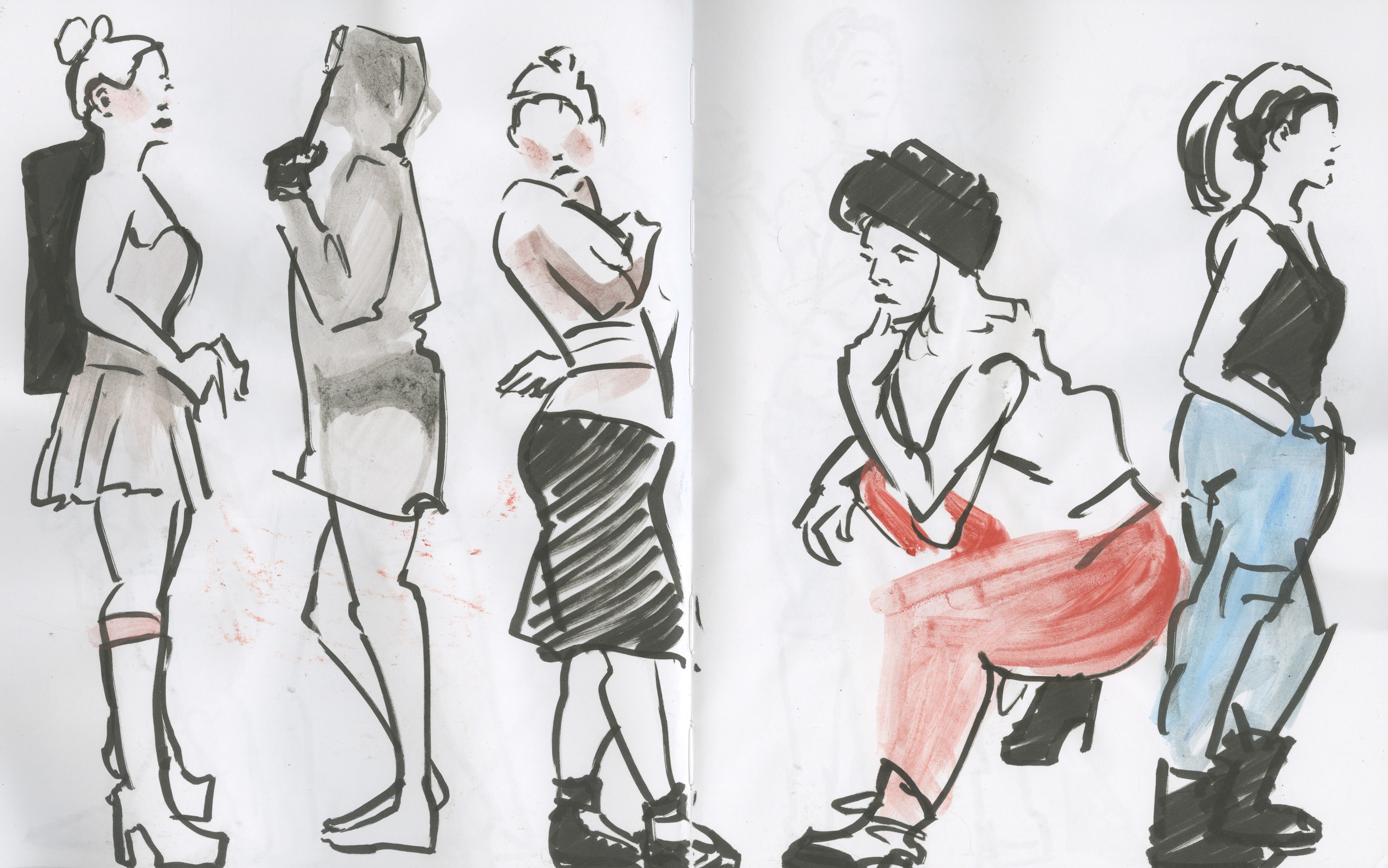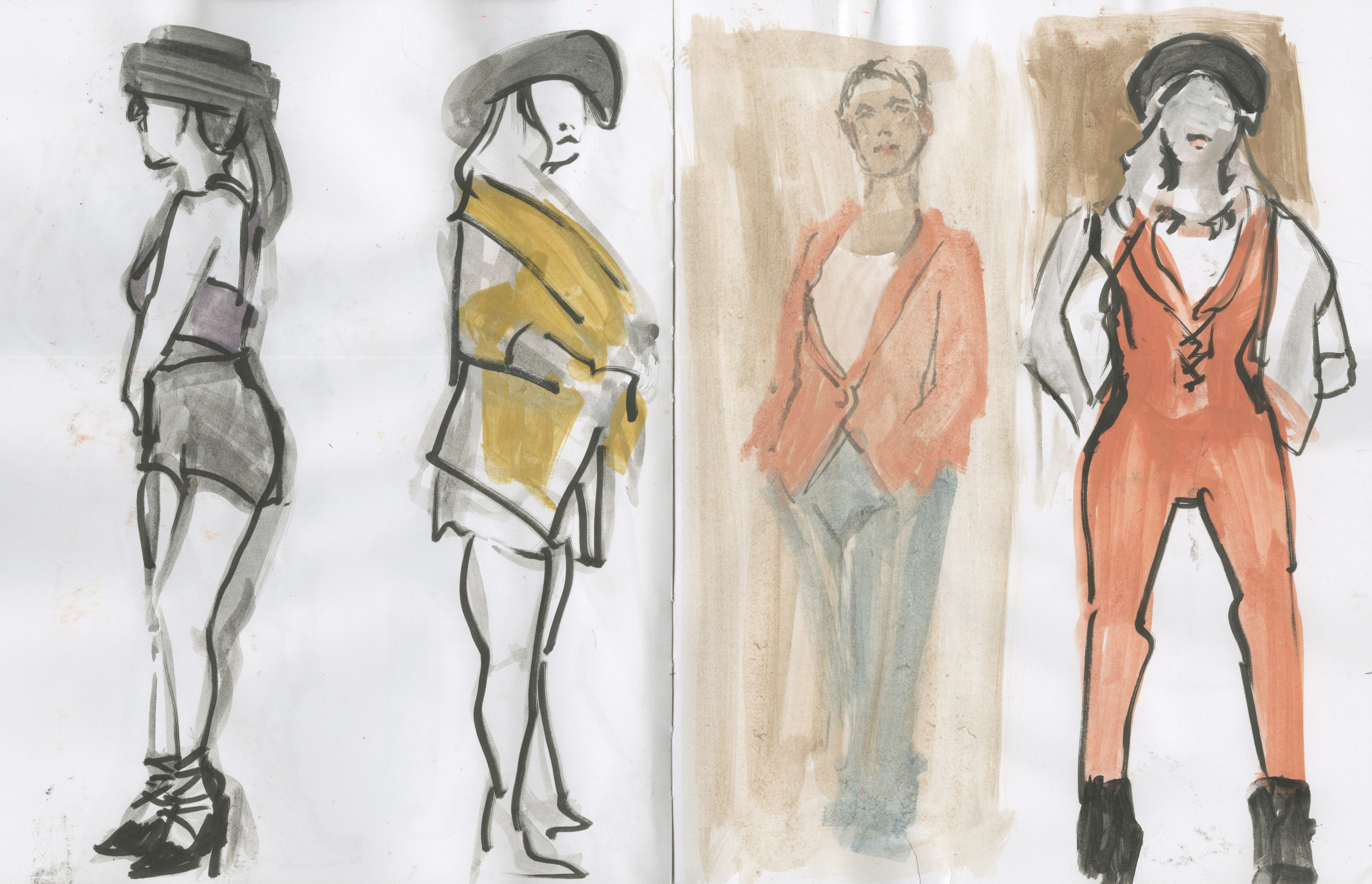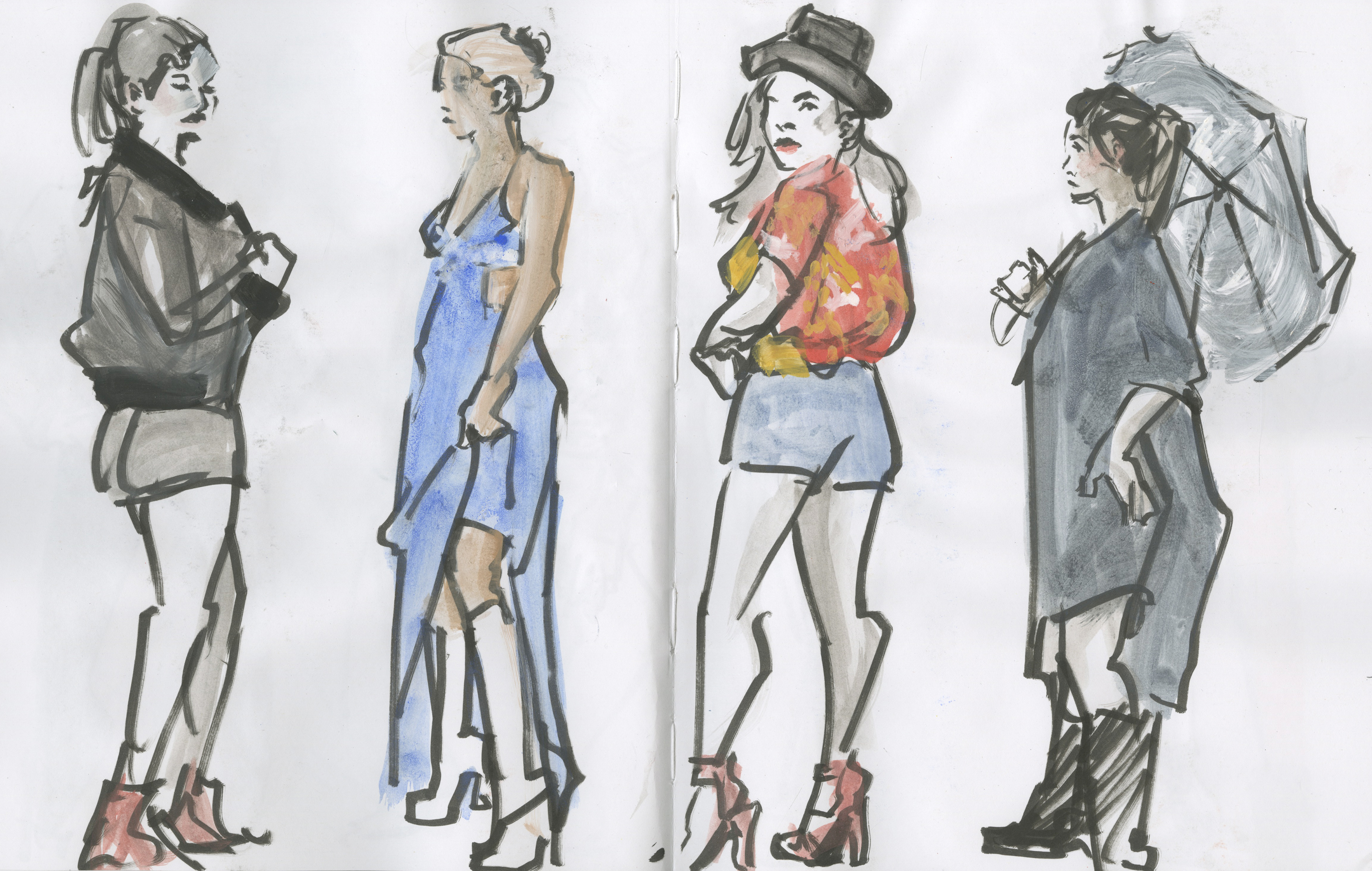 Live fashion sketches from 30 seconds to 5 minutes. Mixed Media.